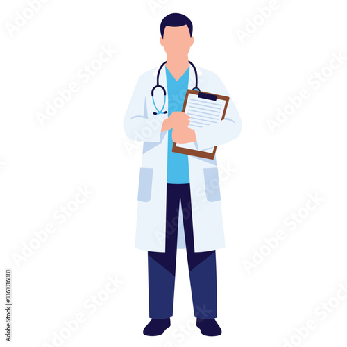 Doktor v bílém plášti izometrický vektor. Lékařský vědec, laboratorní nebo nemocniční pracovník se stetoskopem. Muž osoba znak psaní do schránky izolovaných na bílém pozadí