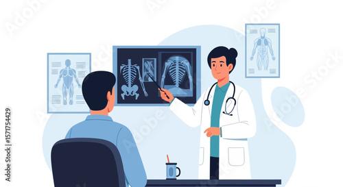 Pacient trpí bolestí kloubů. Lékař ortoped zkoumání xray skenování kolenního kloubu, ploché vektorové ilustrace. Traumatologie a ortopedie. Kolenní artritida, osteoartritida, revmatoidní artritida.