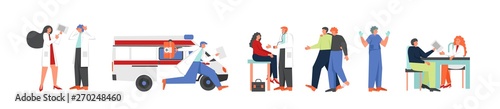 Lékaři a nemocní pacienti, vektorová plochá ilustrace izolovaná na bílém pozadí. Záchranná služba, lékařská prohlídka, předpis, chirurgie. Medicína a zdravotní péče koncept pro web banner, webové stránky.