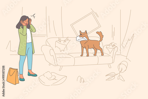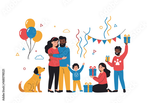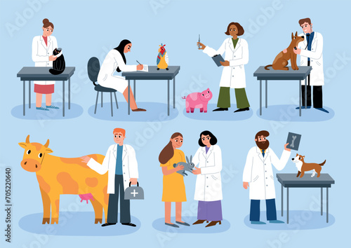 Psi s vítěznými medailemi sedí na vítězném podstavci a jejich šťastní majitelé slaví vítězství, vektorové ploché ilustrace. Psí soutěž, výstava, výstavní koncept pro plakát, banner atd.