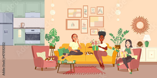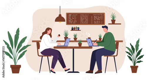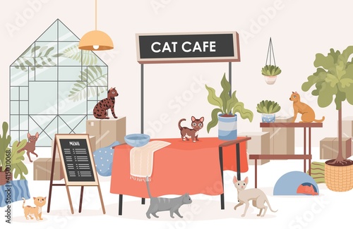 Scéna kavárny vhodná pro psy se šťastnými lidmi, kteří tráví čas majiteli domácích mazlíčků. Ženské a mužské postavy mají sladké občerstvení pití aroma nápoj v jídelně přijímání zvířat vektorové ilustrace
