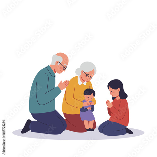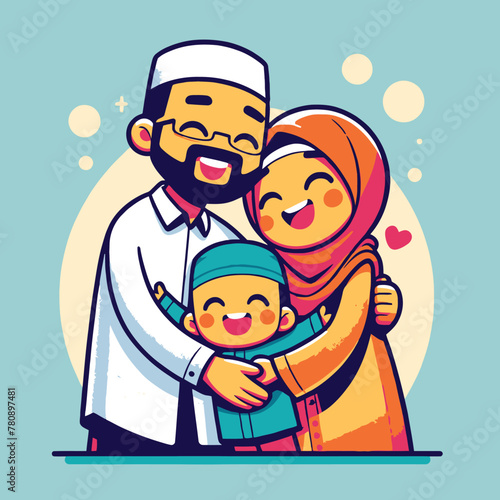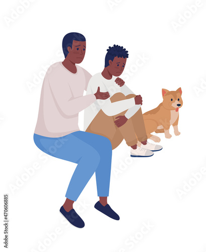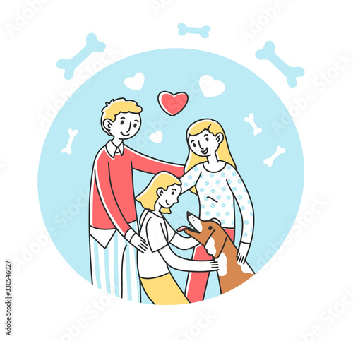 Šťastný chlapec dostává roztomilé štěně dárek od svých rodičů, vektorové ploché ilustrace. Otec a matka překvapují své dítě psím dárkem a dělají mu radost.
