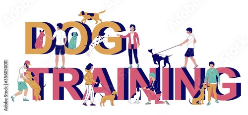 Výcvik psů typografie banner šablona, vektorové ploché ilustrace. Lidé trenéři, majitelé domácích zvířat učí štěňata provádět příkazy, hrát s nimi hry. Hbitost psů, kurzy výcviku poslušnosti.