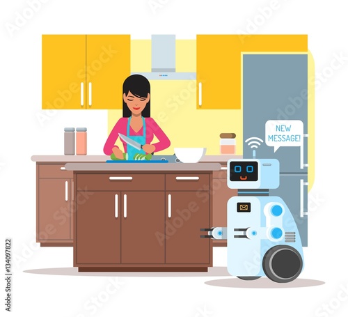 Domácí osobní asistenční robot pomáhá svému majiteli doma. Vektorová ilustrace konceptu robotické technologie.