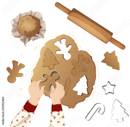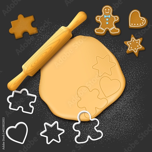 Těsto, dřevěný váleček a Vykrajovátka, vektorové ilustrace. Realistické perníkové muži, hvězda, srdce cookies. Vánoční svátky sladké pečivo.