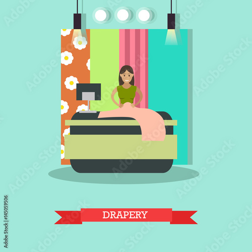 Vektorové ilustrace mladé ženy drapérie hadřík v záhybech. Ateliér, krejčovství, módní salon koncept designový prvek v plochém stylu.