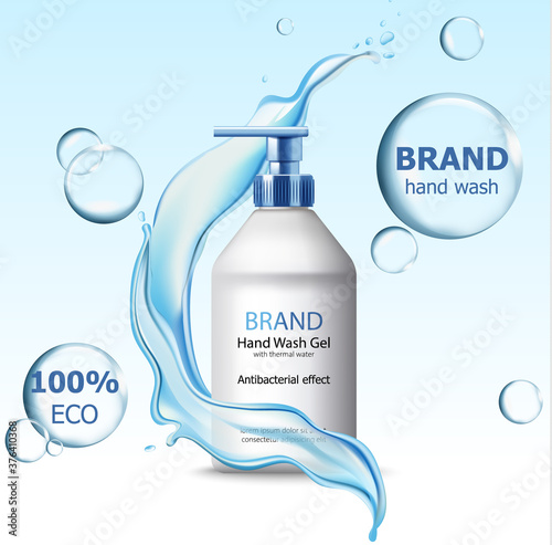 Pití chladnější vody reklamní vektorové realistické ilustrace. Plastová láhev na čistou vodu se štítkem na modrém pozadí s bublinkami a kostkami ledu.