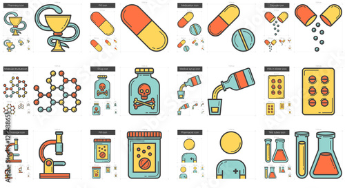 Nápoje a občerstvení, prodejní automat produkt icon set. Vektorové ploché izolované ilustrace. Rychlé občerstvení, hranolky, ořechy,cracker, sušenky, džus, cola, soda atd. Občerstvení a studené nápoje v balení.