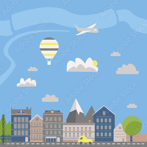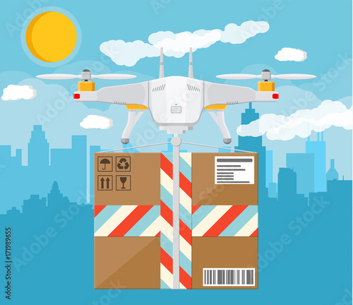 Vektorová ilustrace konceptu dronů. Kvadrokoptéra nesoucí balíček zákazníkovi.