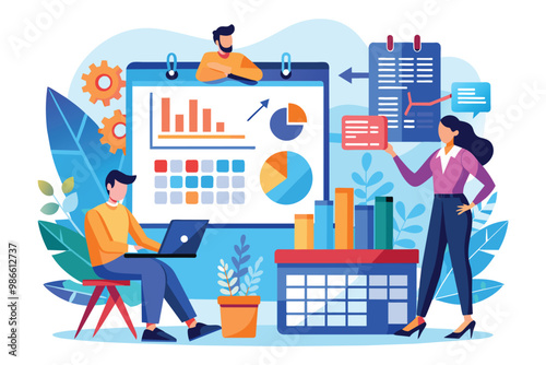 Dron létající nad městem a mikro lidé nesoucí obrovský notebook s fotografií města na obrazovce, vektorová ilustrace. Dálkově ovládané létající roboty, koncept technologie drone pro webovou stránku banneru