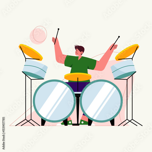 Bubeník vektorové ikony. Rockový nebo jazzový hudební přehrávač izolovaný. Hudebník charakter na bílém pozadí