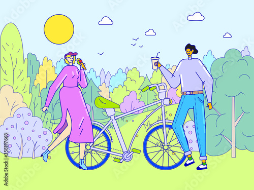 Ekologické dodávky na kole. Poslíček v městské krajině. Víkend doma koncept ilustrace. Vektor web design šablony. Žena jíst sladkosti a dívat se na televizi.