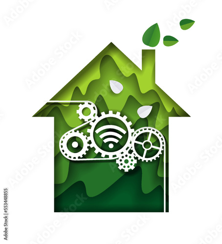Eco smart home vector logo abstraktní design v papíru cut art stylu. Obnovitelná energie pro ilustraci propagace soukromého bytového domu. Environmentální a ekologické technologie