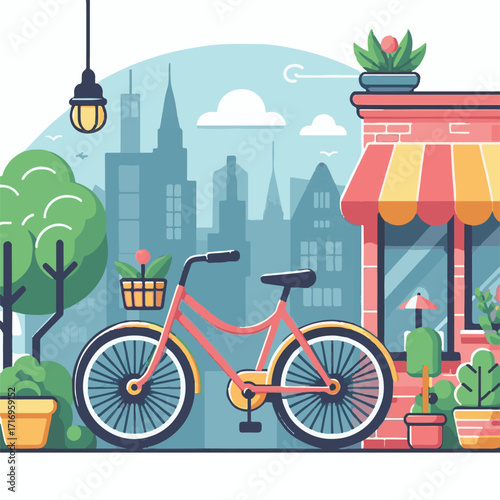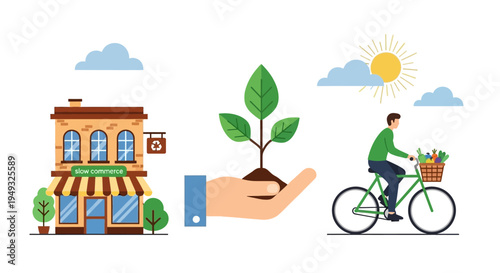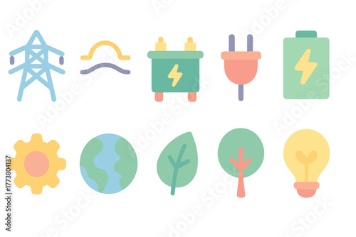 Vektorový plochý design ilustrace větrných turbín, solárních panelů, žárovky, zástrčky, ekologického dopravního kola, ruční držící lahvičky se zeleným výhonkem. Koncept ekologie pro webový banner, webovou stránku atd.