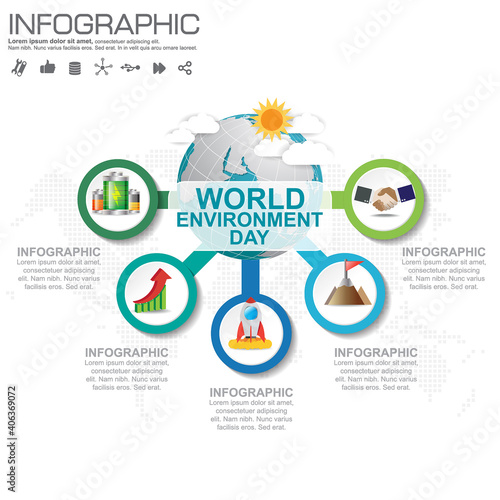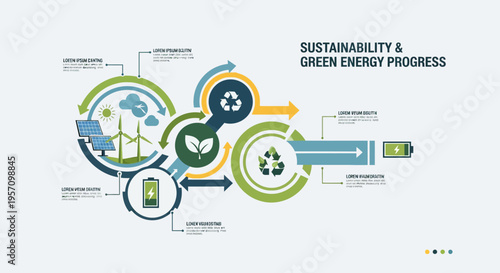 Šablona vstupní stránky ekologie. Vektorový plochý designový koncept pro zelené ekologické webové stránky a vývoj mobilních stránek. Větrné turbíny, solární panely, jízdní kolo, ruční lahvička se zeleným výhonkem.