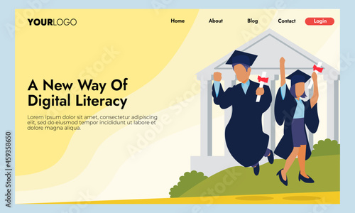 Vzdělávací vektorová webová šablona, návrh webové stránky a vstupní stránky pro vývoj webových stránek a mobilních stránek. Koncept Online vzdělávání s maturitním kloboukem, lidé používající notebooky, držitelé diplomu atd.