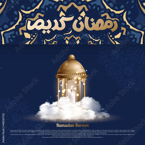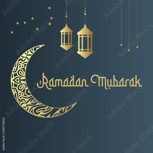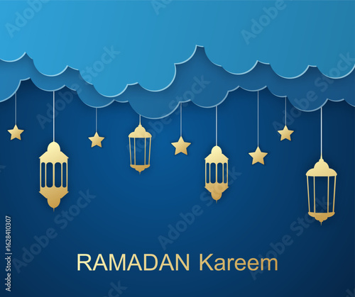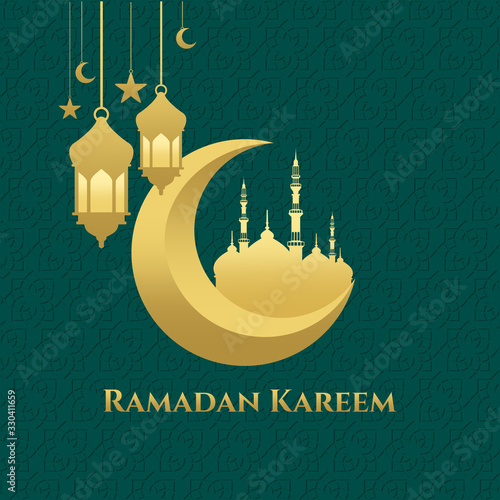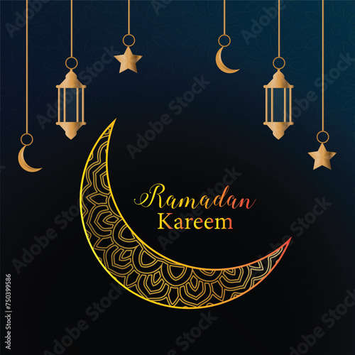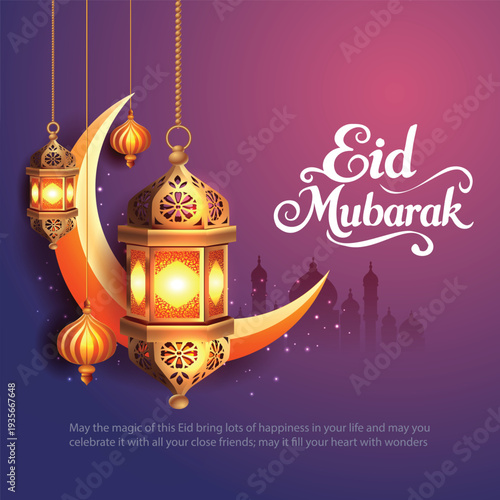 Eid al Adha karty design ve 3D moderním vektorovém stylu. Islámský sváteční banner Eid Mubarak s lucernou ramadánu a Měsícem. Ramadán muslimská dekorace a fialové barevné pozadí.