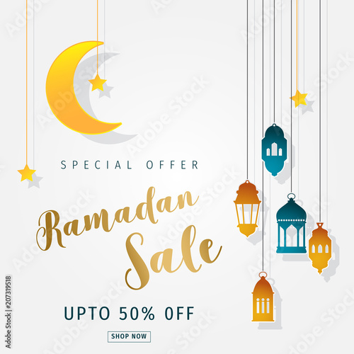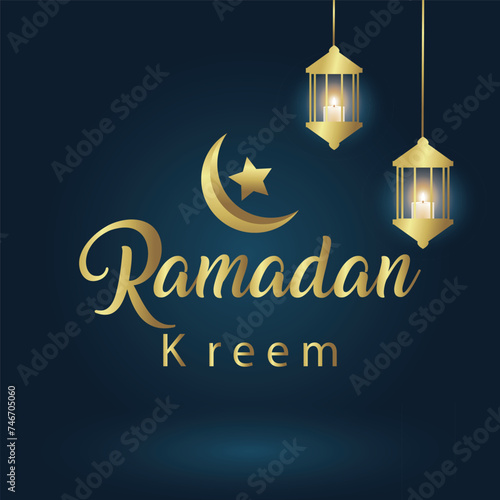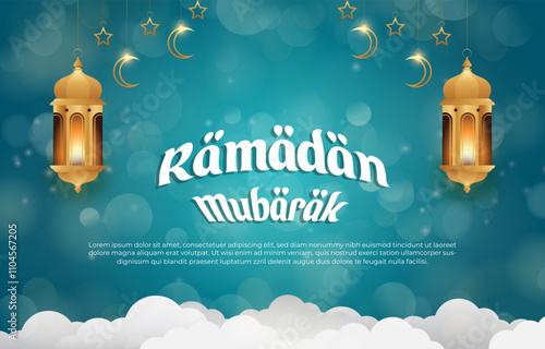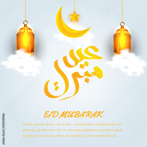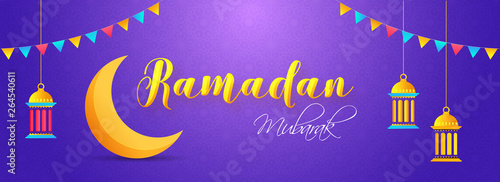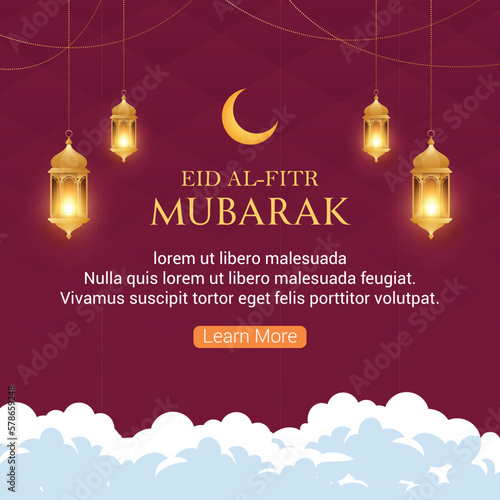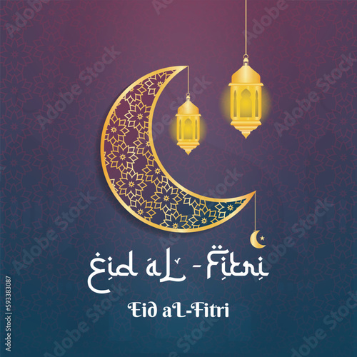 Eid al Adha karty design ve 3D moderním vektorovém stylu. Islámský sváteční banner Eid Mubarak s lucernou ramadánu a Měsícem. Ramadán muslimská dekorace a fialové barevné pozadí.