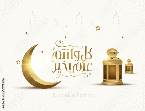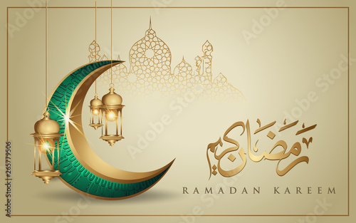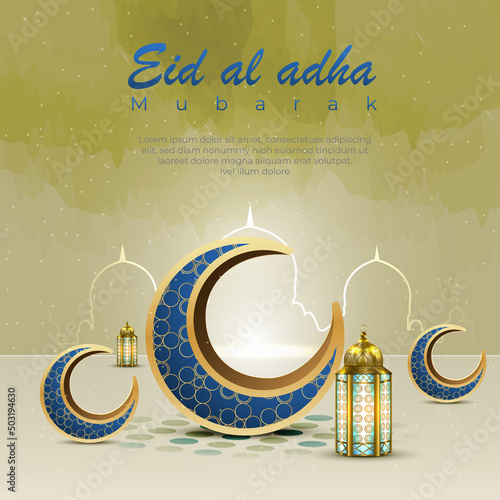 Eid al Adha karty design ve 3D moderním vektorovém stylu. Islámský sváteční banner Eid Mubarak s lucernou ramadánu a Měsícem. Ramadán muslimská dekorace a pozadí. Šťastná oslava Eid al Adha