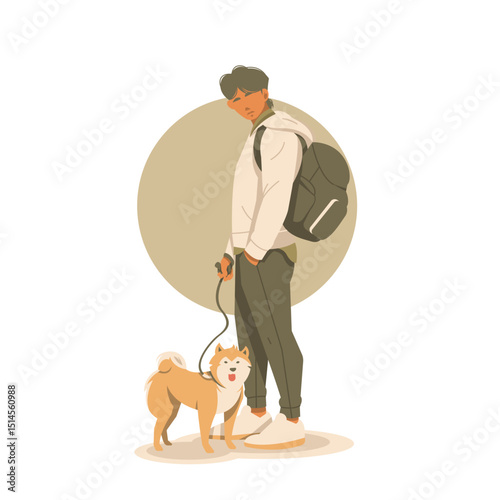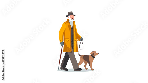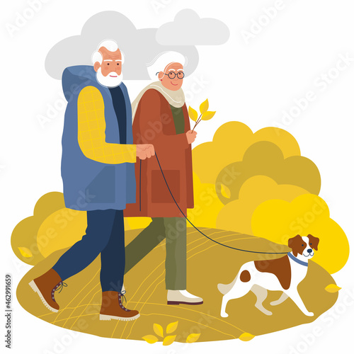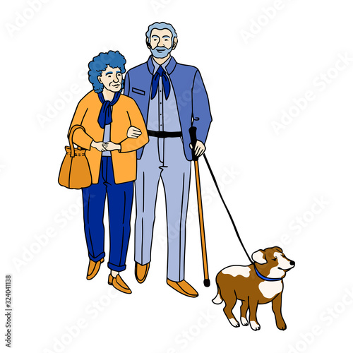 Starší pár chůze se psem vektorové ikony izolovaných na bílém pozadí