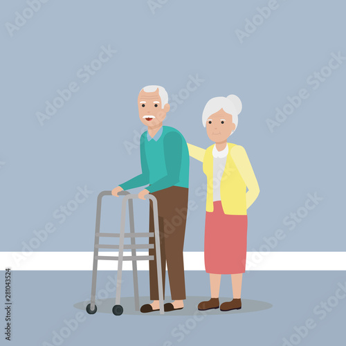 Starší pár chůze po ulici s taškou s potravinami, ploché vektorové ilustrace. Šťastný Starý muž a žena jdou nakupovat jídlo společně. Senioři aktivní životní styl.