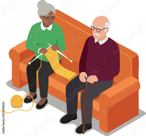 Starší pár sledování televize doma sedí v křeslech, ploché vektorové ilustrace. Staří lidé dělají oblíbené věci pletení, čtení. Životní styl seniorů, domácí volnočasové aktivity.