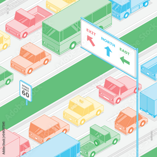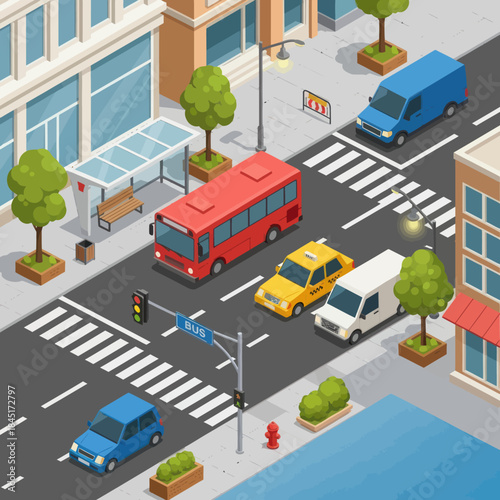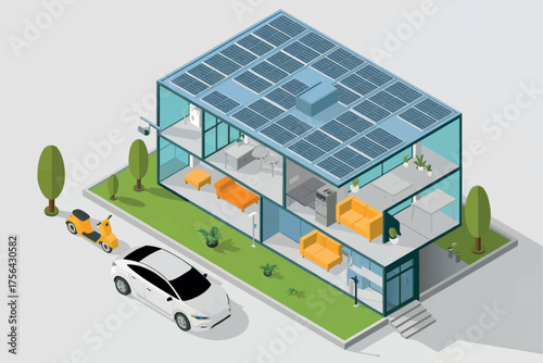 Izometrická ekologická doprava, nabíjecí stanice pro elektromobily se solárními panely, plochá vektorová ilustrace. Elektromobil a Městský veřejný autobus. Zelená energie.