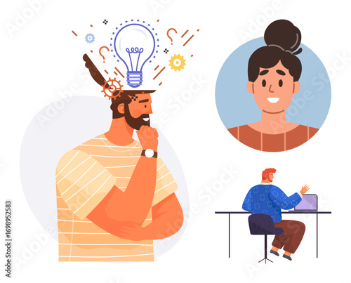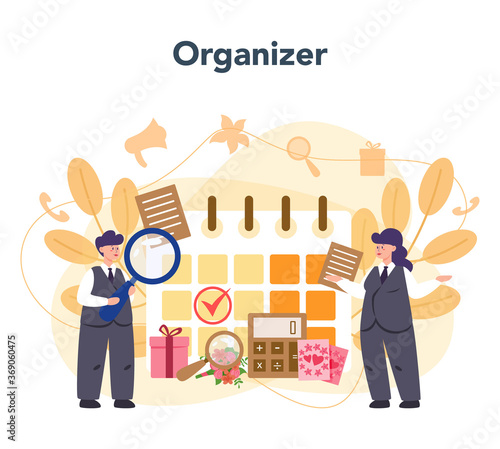 Obrovské žárovky a mikro znaky technici s varovným signálem, zástrčkou, vektorovou ilustrací. Profesionální elektrikář služby složení pro web banner, webové stránky atd.