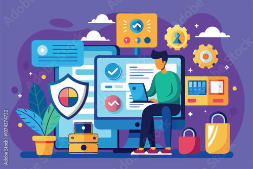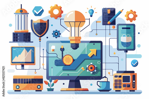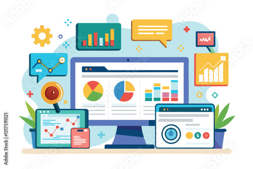 Vektorová ilustrace velké e-knihy s digitální knihovnou, dva muži čtou knihy pomocí tabletu a notebooku, žena s tabletem sedí na hromadě knih. Koncept elektronické knihy pro webový banner, webová stránka.