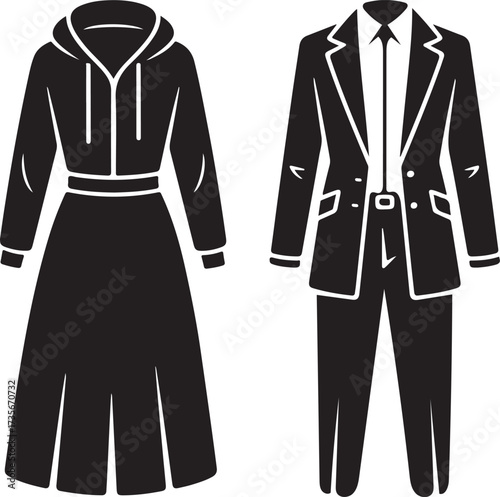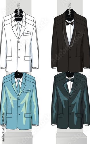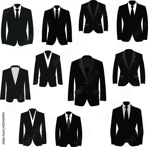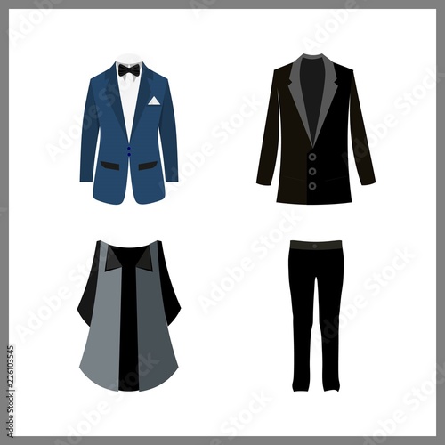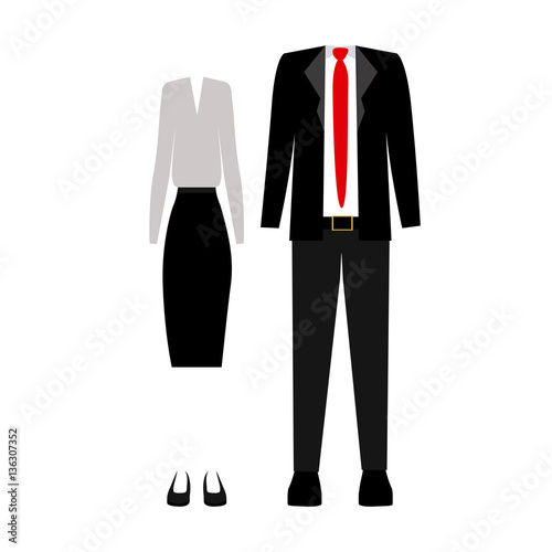 Elegantní muži oblek, vektorové ilustrace izolovaných na bílém pozadí. Obchodní Pánské oblečení, třídílný pánský oblek skládající se z černé bundy, vesty, kalhot, kravaty, bot a bílé košile s límečkem.