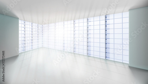 Chrome výtah hala interiér realistické 3D vektor. Uzavřená výtahová kovová brána s kancelářskými dveřmi v chodbě ilustrace. Prázdná budova chodba scéna