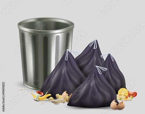 Prázdný odpadkový koš nebo kuchyňský odpadkový kontejner a plné plastové pytle na odpadky, vektorové ilustrace. Potravinové odpadky, organický odpad.