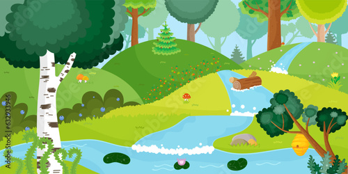 Enchanted vodopád tekoucí z horského útesu nad lesní krajiny papercut vektorové ilustrace. Fantasy stream, cestovní scénický a divoký koncept panoramatu oázy