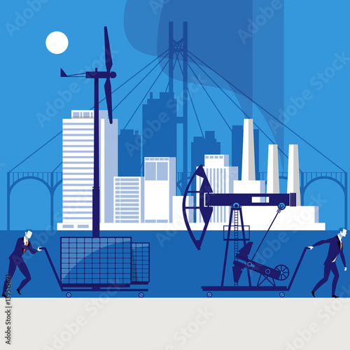 Vektorová ilustrace jednoho podnikatele tlačí vozík s větrným mlýnem a další podnikatel dostat vozík s olejovým čerpadlem pryč. Konstrukční prvek koncepce bezpečnosti životního prostředí.