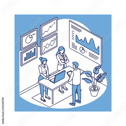 Výstavní stánek, plochá vektorová izometrická ilustrace. Veletrh, scéna propagační akce s promotérem prodeje a zákazníky. Výstavní stánek. Demonstrační stojan na pult.