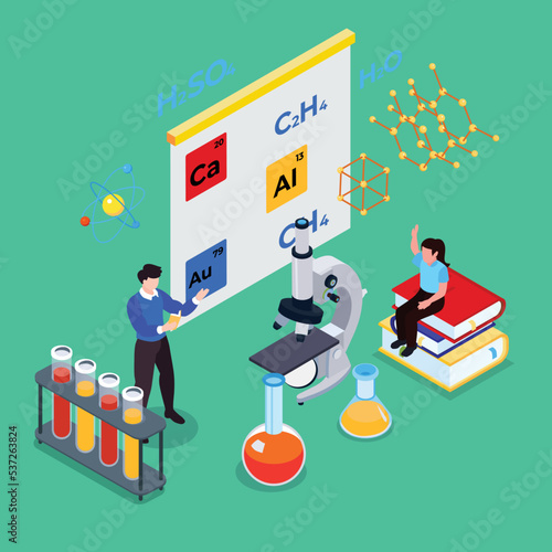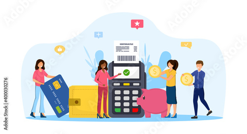 Výstavní stánek, plochá vektorová izometrická ilustrace. Veletrh, scéna propagační akce s promotérem prodeje a zákazníky. Výstavní stánek. Demonstrační stojan na pult.