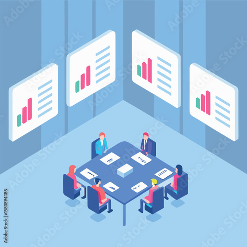Expo event concept vektorové ploché 3D ilustrace. Izometrické výstavní vybavení, promotéři a návštěvníci mladých mužů a žen.