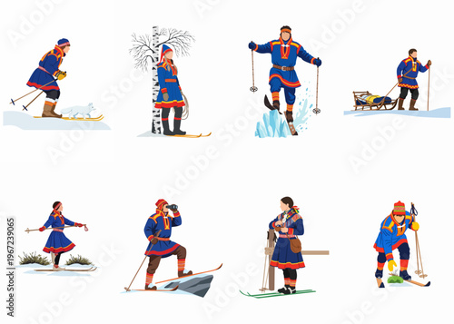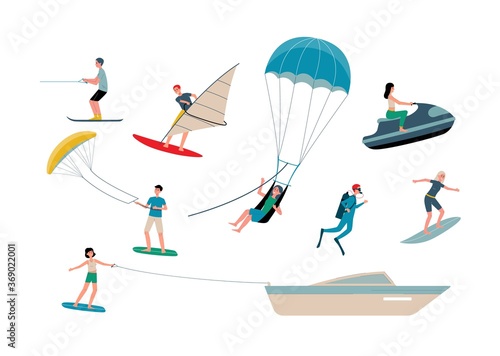 Extrémní vodní sporty mužské postavy, vektorové ploché ilustrace izolovaných na bílém pozadí. Kiteboarding, wakeboarding, windsurfing a flyboarding pláž vodní aktivity, sport a rekreace.