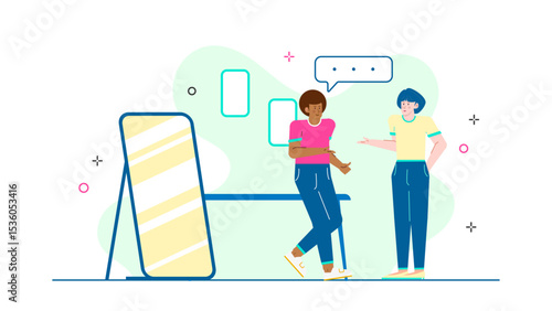 Vektorová ilustrace mladé ženy, která si vybrala látku, aby si vyrobila oblečení. Ateliér, krejčovství, módní salon koncept designový prvek v plochém stylu.