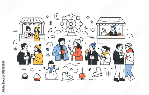 Rozpoznání tváře v davu lidí. Technologie veřejné biometrické bezpečnosti. Ručně kreslený vektor ilustrace. Systém rozpoznávání obličeje.