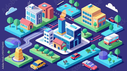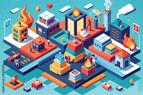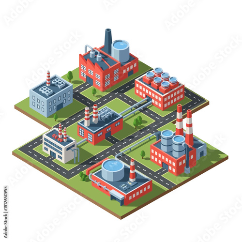 Tovární automatizovaná výrobní linka vektorové ploché izometrické ilustrace s dopravníkovým pásem, průmyslovými roboty a výrobním zařízením.