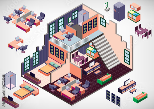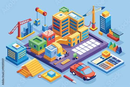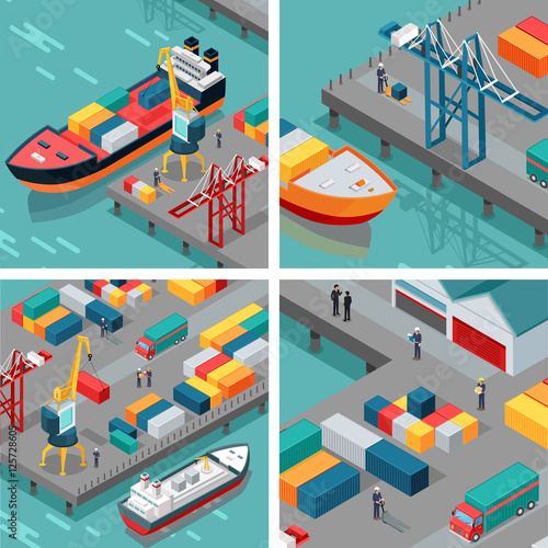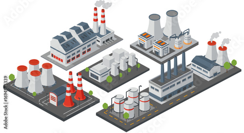 Tovární automatizace vektorové ploché izometrické plakát set. Továrna na elektroniku, obalová manufaktura, montáž automobilů, koncepční prvky lékařské továrny pro webové bannery, tisk, infografiky.