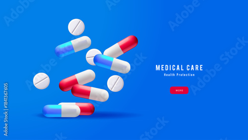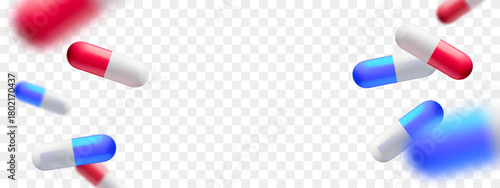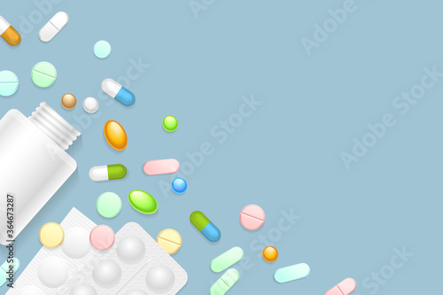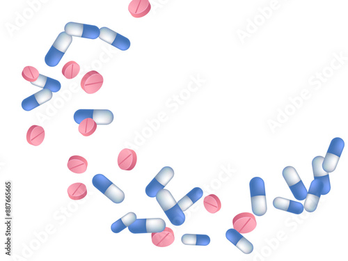 Padající pilulky pozadí, rám. Vektorové realistické ilustrace farmaceutických kapslí, tablet, kapslí a softgelů.