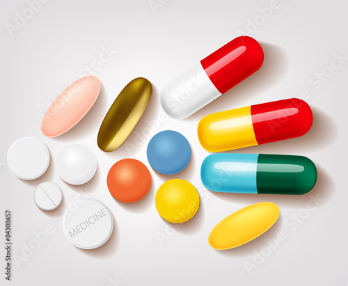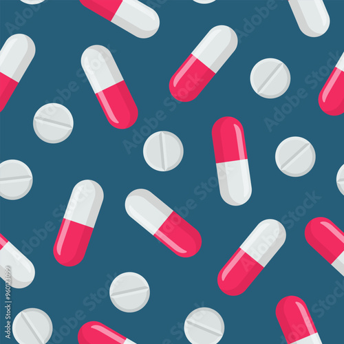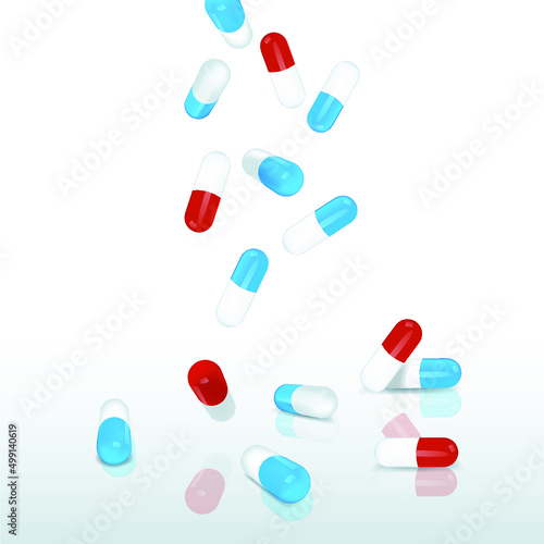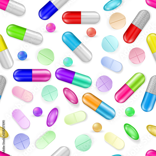 Padající pilulky bezešvé vzor. Vektorové realistické farmaceutické kapsle, tablety, kapsle a softgels.