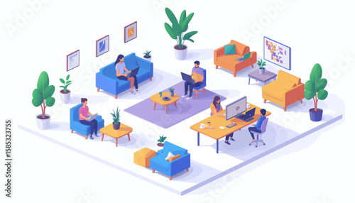 Rodinné postavy sledující film sedí na pohovce v obývacím pokoji a vaří v kuchyni, plochá vektorová izometrická ilustrace. Rodinný životní styl.