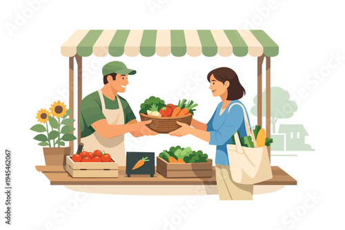 Muž a žena rodinný pár nákup zemědělských produktů v hotovosti na pouličním trhu vektorové ilustrace. Tradiční platba za jídlo