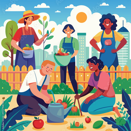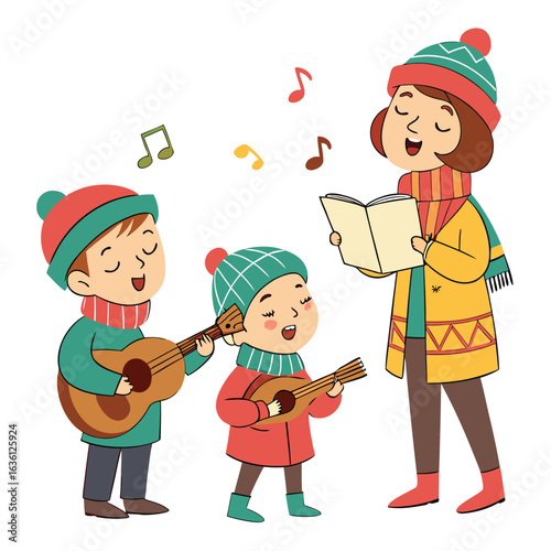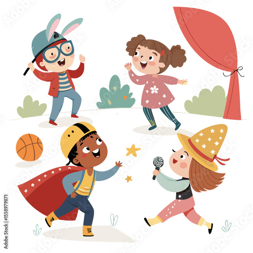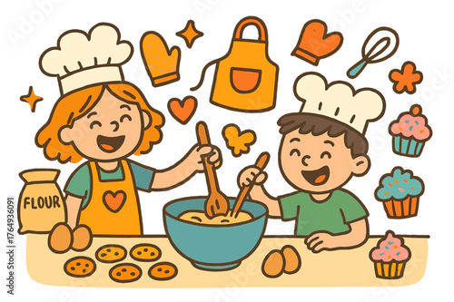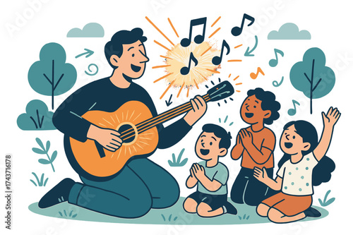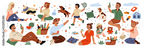 Rodina velikonoční oslava scéna set, plochý vektor izolované ilustrace. Šťastná máma, táta a děti na sobě králičí uši čelenka s králíkem, zdobené velikonoční vajíčka, dort, košík.