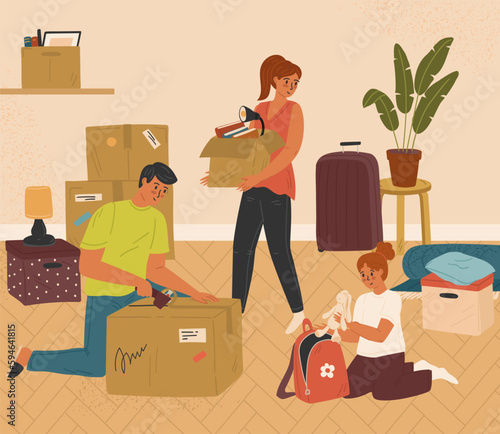Rodina se stěhuje do nového domova a balí kartonovou krabici s domácími věcmi, vektorové ilustrace. Postavy lidí balí věci. Koncept služby Stěhování a přemístění domu.