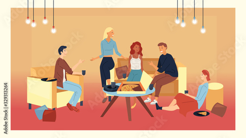 Rodina tráví čas doma, ploché vektorové ilustrace. Ženské postavy, kterým se stolu, dělá jógu, sedět na pohovce a jíst popcorn v hale. Domácí rutina. Domácí práce a volnočasové aktivity.