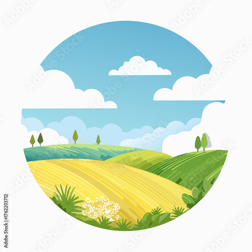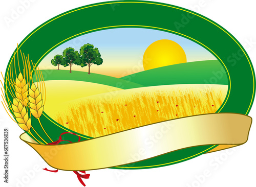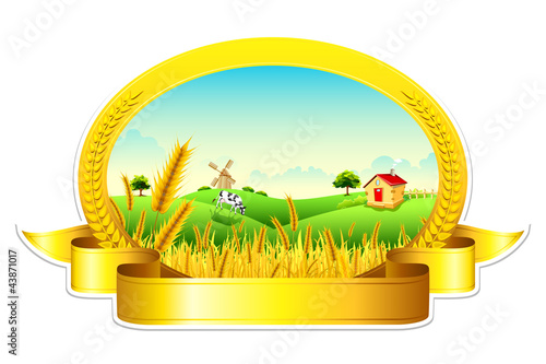Farma vektorové logo. Ranč s organickým polem. Venkovská krajina s traktorem, mlýnem a ječmenem nebo pšeničnými kopci. Statek na venkově. Styl řezu papíru